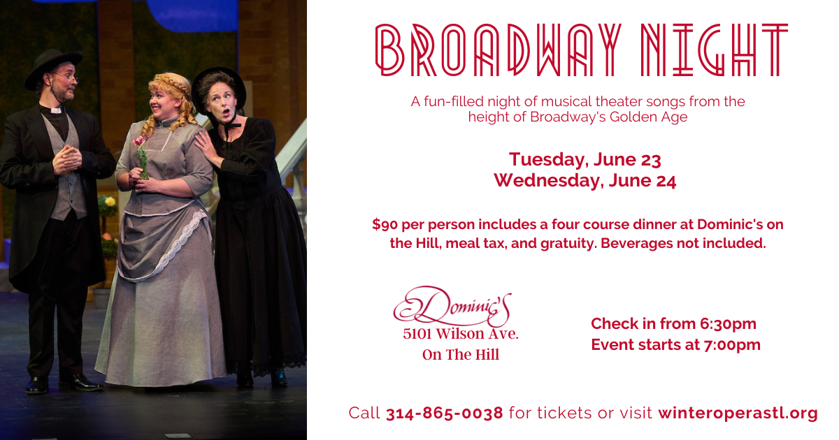 A fun filled night of musical theater songs from the height of Broadway's Golden Age sung by Winter Opera Artists. $90 per person includes a four …