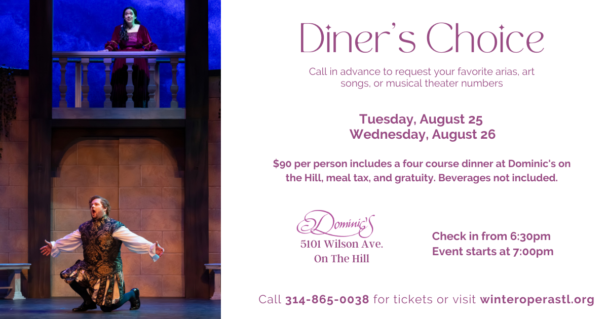 Request your favorite arias, art songs or musical theater pieces sung especially for you by Winter Opera artists. $90 per person includes a four course …