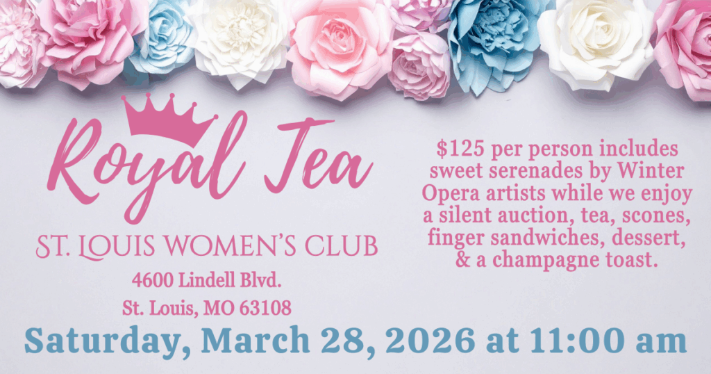 It’s tea time! Join us at The Saint Louis Woman’s Club on Saturday, March 28th, 2026 for sweet serenades by Winter Opera artists while we enjoy a silent auction, tea, scones, finger sandwiches, dessert, and a champagne toast. Guests with food allergies should let us know no later than the Tuesday prior to the day of the event.